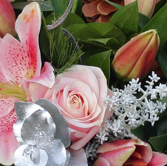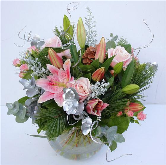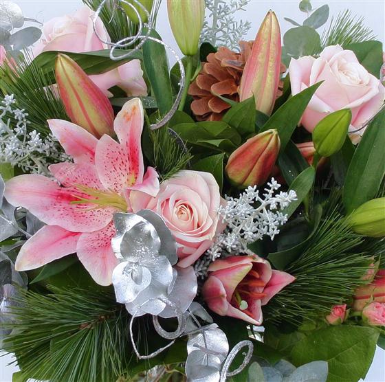 A pretty, pink and silver festive hand-tied including scented lilies and roses.