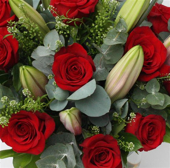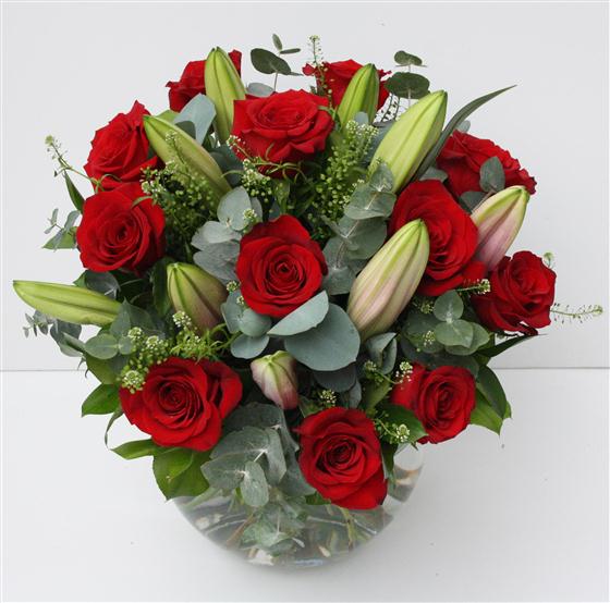 A dozen sumptuous red roses and pink stargazer lilies are included in this fragrant hand-tied.